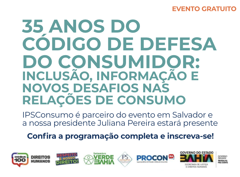 35 Anos do Código de Defesa do Consumidor: Inclusão, Informação e Novos Desafios nas Relações de Consumo – IPSConsumo é parceiro do evento em Salvador e a nossa presidente Juliana Pereira estará presente!